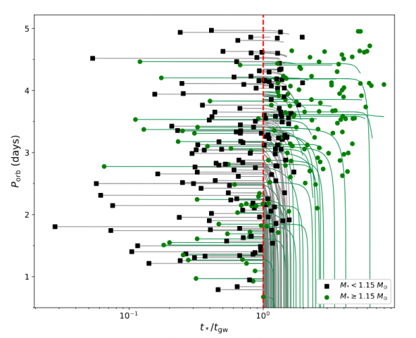 Рисунок. Распределение горячих юпитеров на диаграмме “возраст – орбитальный период”. Возраст нормирован на время начала диссипации гравитационных волн. Черным (зеленым) отмечены горячие юпитеры в системах, где звезда имеет лучистое (конвективное) ядро. Сплошными линиями показана орбитальная миграция динамически молодых горячих юпитеров на более поздних этапах их эволюции.